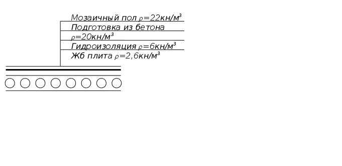 Постоянная Мозаичный пол 0,04 22 Подготовка из бетона 0,03 20 Гидроизоляция 0,003 6 Железобетонная плита Итого Временная для магазина Полная | 0,88 0,6 0,02 2,6 ~4,1 4 8,1 | 1,3 1,2 1,2 1,1 1,2 | 1,14 0,72 0,02 2,86 4,74 4,8 9,54 |