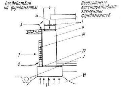 Воздействия на фундаменты: 1тАФ грунта и грунтовых вод; 2 тАФ проВнмерзания и пучения; 3 тАФ атмосферных осадков; 4 тАФ нагрузок