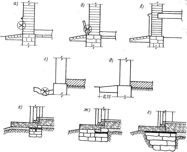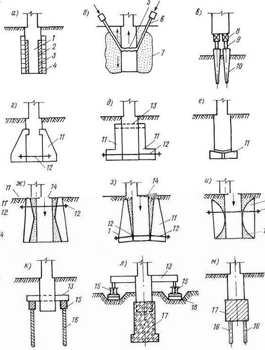 а тАФ облицовкой при повреждении фундамента агрессивными водами; б тАФ нагнетанием раствора в разрыв при морозном пучении; в тАФ пуВнтем подведения свай; г, д, е, ж, з, и - уширение подошвы с поВнмощью железобетонных приливов и стальных тяжей; к, л, м тАФ под-
