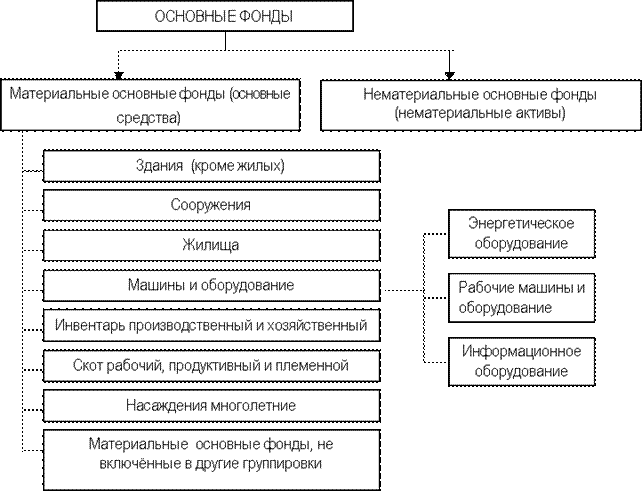 К материальным основным фондам (основным средствам) относятся здания, сооружения, машины и оборудование, измерительные и регулирующие приборы и устройства, жилища, вычислительная техника и оргтехника, транспортные средства, инструмент, производственный и хозяйственный инвентарь, рабочий, продуктивный и племенной скот, многолетние насаждения и прочие виды материальных основных фондов.