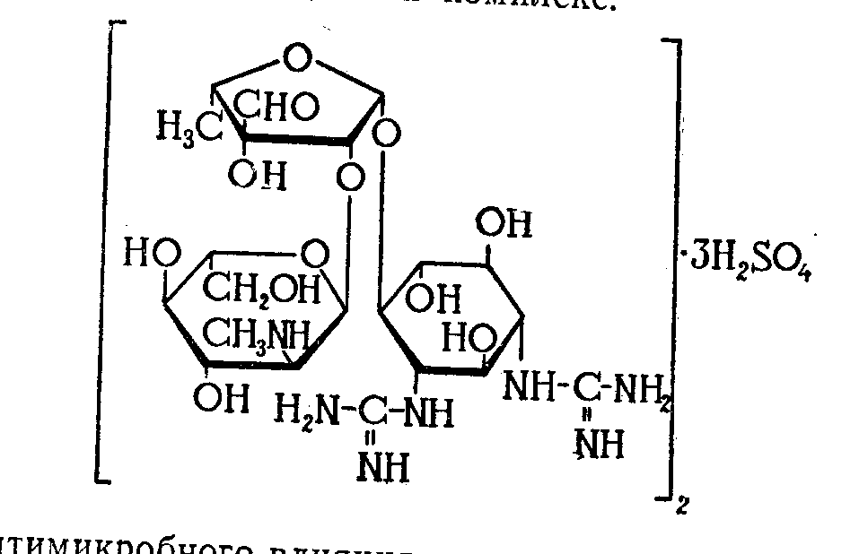 Группа стрептомицина. СтрептомицинтАФсложное органическое соединение, состоящее из стрептидина и стрептобиозамина. При гидролизе он распадается на эти составные части, лишенные антибакВнтериальной активности. Как основание, стрептомицин легко образует соли, из которых наибольшее значение имеют сульфат