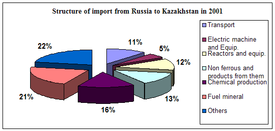 Import of republic of Kazakhstan goes into first five of the countries of the basic trade partners of Russia in import. The specific gravity of import of Russia has increased in total amount of the Kazakhstan import from 36,7 % per 1999 up to 45,4 % per 2001. There were insignificant variations in groups of imported commodity production. So, the volumes of import were reduced