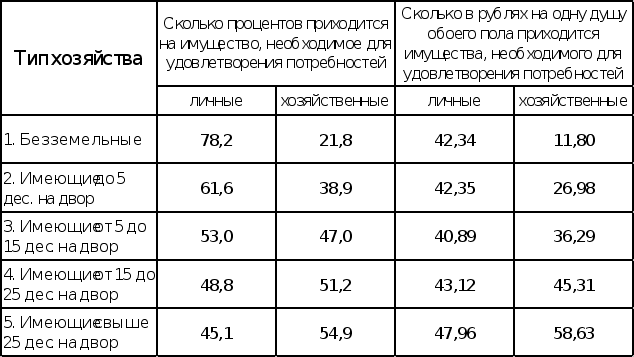 Из таблицы №2 мы видим прямую связь между личными и хозяйственными видами имущества. Если у бедняка мало инвентаря, скота и т.д., а если еще он относится к категории "безземельные", то ценность остального имущества возрастет. Таблица подтверждает мысль о том, личные потребности возрастают от малоземелья к многоземелью, то же можно сказать и о хозяйственных потребностях, рост которых происходит быстрее. Таким образом, мы видим, что личные и хозяйственные потребности составляют одну из категорий бюджета.
