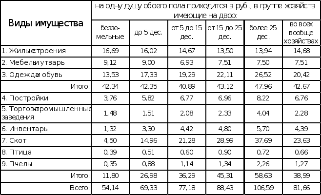 Состав имущества в мелких земледельческих хозяйствах состоит из: строений, мебели с утварью, одежды, обуви, мертвого инвентаря, то есть сельскохозяйственных орудий и живого инвентаря (домашний скот, птица, наемные рабочие). В хозяйствах, имеющих достаточное количество земли, большую ценность составляет земля. Виды имущества можно представить в таблице и таким образом проследить динамику распределения различных видов имущества от малоземелья к многоземелью (см. табл. №2).