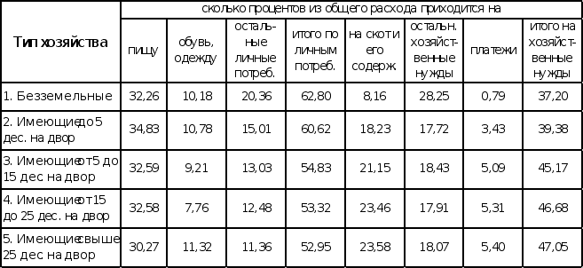 Из таблицы №1 мы видим, что личные потребности уменьшаются от безземелья к многоземелью, а хозяйственные наоборот возрастают, то есть чем беднее хозяйство, тем относительно больше оно тратит на пищу, одежду, и меньше на содержания своего хозяйства. Но как только у крестьянина появлялись материальные средства, он начинал увеличивать свое хозяйство, что сопровождается и увеличением расходов на это хозяйство.