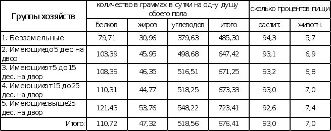 Таким образом, чем больше обеспечена группа землею или чем богаче она, тем в большем количестве входят в пищевую порцию основные элементы питания и больше абсолютное количество потребляемой пищи.