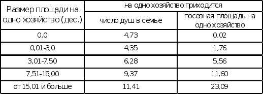 Можно выявить связь между размерами земли и размерами хозяйства с количеством рабочей силы в семье. Это можно проследить на данных связи между размерами семьи и размерами посевной площади (табл.№8).