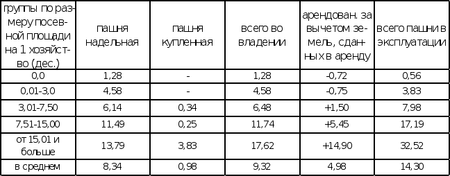 Таблица №8 свидетельствует о том, что размер семьи влияет на размер площади хозяйства, причем с увеличением семьи происходит и увеличение посевной площади. Однако следует учитывать и тот вариант, что крестьяне могли и арендовать землю. Последний аргумент хорошо представлен в таблице №9.