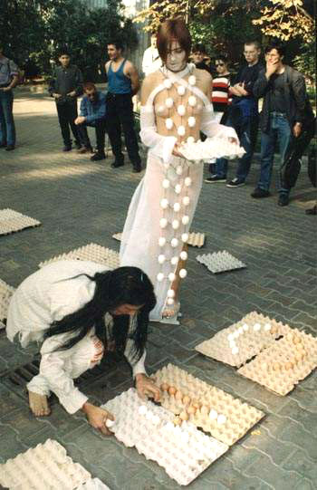Тема яйца неисчерпаема тАУ несколько лет назад, на рубеже веков, была проведена акция Сергея Войченко и Владимира Цеслера ВлПроект века "Двенадцать из двадцатого"В». Главная мысль акции была в том, что это послание нашего уходящего XX века будущему. ВлПроект векаВ» - это еще прощание и благодарность тем, кто отражал свое время, его дух, и создавал совершенно новые направления в искусстве на протяжении двадцатого столетия, тем крупнейшим художникам прошедшего века, чье творчество повлияло на пути развития искусства и современного образа мышления. В объектах - современной метаморфозе скульптуры, коими являются яйца, воплощены своеобразные портреты их идей. Матово-черное яйцо Каземира Малевича и прозрачное как слеза тАУ Иосифа Бродского, оплывшее золото Сальвадора Дали и ежик из гвоздей Гюнтера Юккера. Работа над проектом длилась четыре года и потребовала настоящих технологических открытий. Задуманные в разных материалах (мрамор, чугун, эпоксидная смола, акрилат итп), доведенные до технического идеала объекты выполнялись самыми разными способами. Даже конверсия послужила на этот раз вечному и прекрасному - некоторые работы производились на ранее недоступных военных заводах. Посмотреть выставку этой акции можно было и в Москве в Пушкинском Музее и в Питере в Русском Музее.