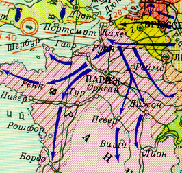 | На рассвете 10 мая 1940 после тщательной подготовки нем.-фаш. войска (135 дивизий, в т. ч. 10 танк. и 6 моторизов., и 1 бригада, 2580 танков, 3834 самолёта) вторглись в Бельгию, Нидерланды, Люксембург, а затем через их терр. и во Францию. Гл. удар массой подвижных соединений и авиации немцы нанесли через Арденнские горы в обход тАЬлинии МажинотАЭ с С., через сев. Францию к побережью Ла-Манша. |