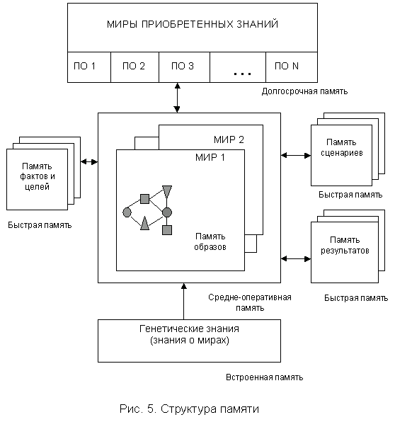 - память фактов, а также память сценариев - наиболее часто изменяемые структуры памяти (оперативная память). В памяти фактов находятся исходные и конечные, а также все промежуточные факты, получаемые в процессе рассуждений и расчетов; память сценариев также подвергается преобразованиям, в первую очередь, связанным с обобщением и конкретизацией сценариев;
