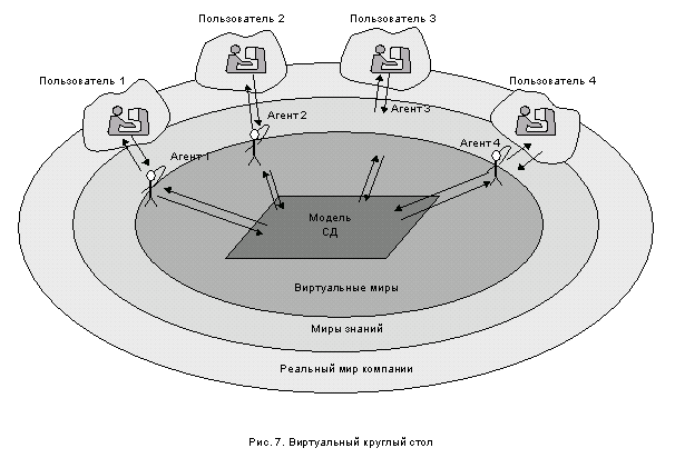 Для моделирования процесса переговоров между членами временно организуемых рабочих групп или их Агентами в разрабатываемой мультиагентной системе реализуется виртуальный круглый стол. Виртуальный круглый стол может реализовываться как через локальную, так и через глобальную сети (рис. 7).