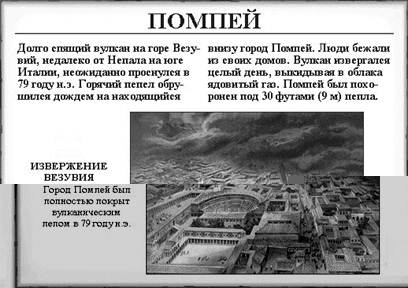 Частково зовнiшнiй вигляд римського мiста можна уявити на прикладi Помпеi тАУ iталiйського мiста, що разом з мiстами Геркуланум i Стабiя загинув у 79р. н.е. у результатi виверження вулкану Везувiй. Поховане пiд попелом мiсто випадково знайшли при будiвництвi водопроводу у XVРЖРЖ ст. З 1748 р. До наших днiв продовжуються його розкопки. Мiсто мало регулярне планування. Прямi вулицi обрамлялися фасадами будинкiв, унизу яких були улаштованi лавки-таверни. Великий форум був обнесений прекрасною двоповерховою колонадою. Там знаходилися святилище РЖсиди, храм Аполлона, храм Юпiтера, великий амфiтеатр, побудований, як i в грекiв, у природному поглибленнi. Розрахований на двадцять тисяч глядачiв, вiн значно перевершував потреби жителiв мiста i призначався також для приiжджих (населення Помпеi складало не бiльш десяти тисяч чоловiк). У мiстi було два театри.