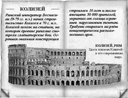 Колiзей тАУ найбiльший амфiтеатр античноi епохи. Вiн умiщав бiля птАЩятдесятьох тисяч глядачiв. Могутнi стiни Колiзею (висота 48,5м) роздiленi на чотири яруси суцiльними аркадами, у нижньому поверсi вони служили для входу i виходу. У планi Колiзей являi собою елiпс (156X198м); центр його композицii тАУ нинi зруйнована арена, оточена схiдчастими лавами для глядачiв. Елiпс найбiльш повно вiдповiдав вимогам динамiки видовищ, що розгортаються тАУ гладiаторських боiв. Вiн давав можливiсть максимально активiзувати глядача, наблизити мiсця привiлейованоi публiки до арени; що спускалися лiйкою, роздiлялися вiдповiдно до суспiльного рангу глядачiв. Усерединi йшли чотири яруси сидiнь, яким зовнi вiдповiдали три яруси аркад: дорична, iонiчна i коринфська. Четвертий ярус був глухим, з коринфськими пiлястрами тАУ плоскими виступами на стiнi. Пiлястри, що членують стiну, коринфського ордера не порушують монолiт будинку, викладеного iз сiрого травертину.