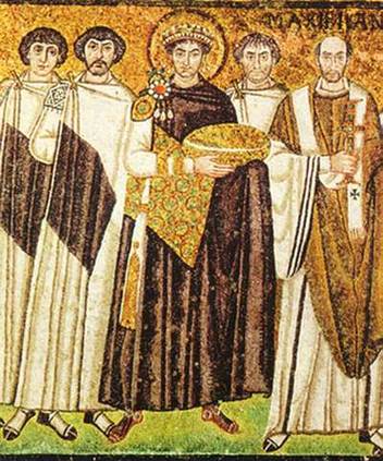Переход от античности к "средним" векам вызвал глубокий кризис в художественной культуре, обусловив исчезновение одних и зарождение других видов и жанров изобразительного искусства. Главную роль начинают играть виды искусства, связанные с церковными и государственными нуждами, тАФ стенные росписи, иконопись и книжная миниатюра (преимущественно культового характера). Проникаясь средневековым религиозным мировоззрением, искусство изменяет свою образную природу. Представление о человеческой ценности переносится в потусторонний мир. В связи с этим разрушается антический пластический метод, вырабатывается средневековая условность искусства, которое отныне отражает реальность не путём её прямого изображения, а преимущественно с помощью духовно-эмоционального строя художественных произведений. Условные изображения наделяются устойчивым эмоционально-духовным смыслом (мозаики с изображением имп. Юстиниана и его жены Феодоры в церкви Сан-Витале в Равенне, ок. 547;