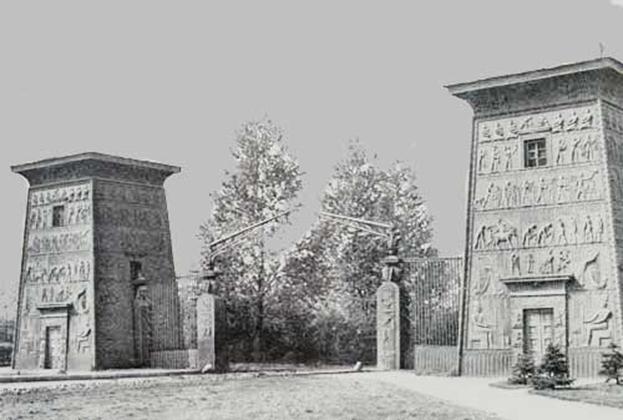 Египетские воротапостроены в 1827-1830гг. по проекту арх. А. Менеласа. Две каменные караулки ворот воспроизводят форму египетских пилонов, суживающихся кверху. Они увенчаны красиво изогнутыми массивными карнизами, отлитыми из чугуна. Выкружки карнизов украшены изображениями скарабея с солнечным диском и двумя змеиными головами. Плоскости стен караулок облицованы чугунными плитами с рельефными изображениями различных сцен из мифологии и быта древних египтян. Барельефы расположены в шесть рядов, причем высота каждого последующего ряда меньше, чем предыдущего. К стенам караулок примыкают монументальные чугунные гермы. Аналогичные гермы, но двусторонние, служили опорами ворот. Отливка всех элементов ворот производилась на С.-Петербургском чугунолитейном заводе. Рисунки рельефов в натуральную величину исполнил художник Василий Додонов. Он использовал в своей работе графические материалы многотомного издания, вышедшего в свет в начале XIX века в Париже и посвященного результатам изысканий французских ученых, сопровождавших Бонапарта в его египетском походе. Модели барельефов и герм лепил скульптор В. И. Демут-Малиновский. Все модели были выполнены в течение весны и лета 1827 года. В процессе строительства гранитный цоколь заменили цоколем из чугунных плит, поверх которого устанавливались плиты с иероглифическими изображениями. Внутреннее пространство пилонов разделено перекрытиями на три этажа. Помещения освещаются небольшими окнами, равными по высоте одному ряду барельефов. В 1941тАФ1944 годах воротам были нанесены тяжелые повреждения. Часть чугунных плит была разбита осколками снарядов. При восстановлении ворот поврежденные части облицовки отлиты заново.