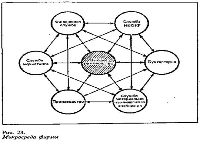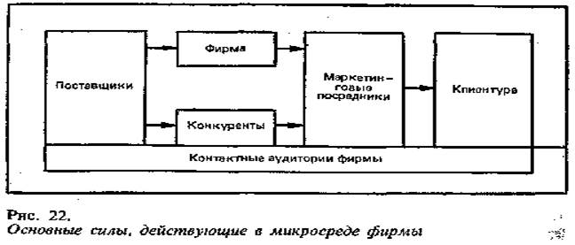 Маркетингове середовище складаiться з мiкросередовища i макросередовища. Мiкросередовище представлене силами (мал. 5), що мають безпосереднi вiдношення до самоi фiрми i ii можливостей по обслуговуванню