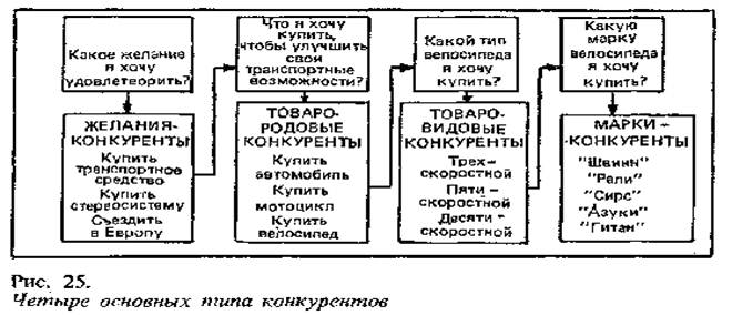 Це товарно-родовi конкуренти, тобто iншi основнi способи задоволення якого-небудь конкретного бажання. Якщо найбiльш привабливою альтернативою виявиться придбання велосипеда, Джон буде думати, який тип велосипеда купити. З'являiться цiлий ряд товарно-видових конкурентiв, тобто iнших рiзновидiв того ж товару, здатних задовольнити конкретне бажання покупця. У даному випадку, рiзновидами товару будуть трьох-, п'яти- i десятишвидкiснi велосипеди. Джон, можливо, зупиниться на десятискоростном велосипедi, пiсля чого йому напевно захочеться познайомитися з декiлькома марками-конкурентами. Це рiзнi марки того самого товару, здатнi задовольнити його бажання. У даному випадку це "Швiнн", "Ралi", "Сiрс", "Азукi" i "Гiтан".