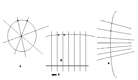 Так вот, первый вид пучков образован прямыми, имеющими общую точку тАУ центр пучка (рис. 4а). Пучок расходящихся прямых тАУ это перпендикуляры к одной прямой тАУ оси пучка (рис. 4б). Из этого определения выходит интересное и, казалось бы, абсурдное утверждение, что два перпендикуляра к одной прямой непараллельны, и отличие от геометрии Евклида.