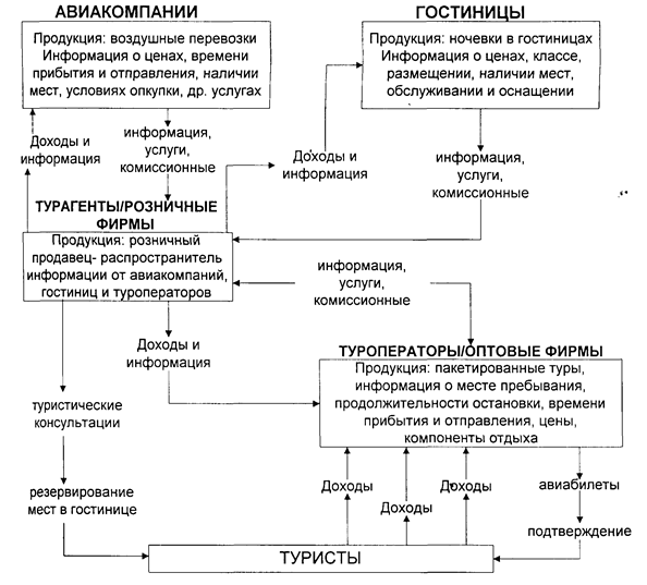 Как известно основу туристической индустрии составляют фирмы туроператоры и турагенты занимающиеся туристическими поездками, продажей их в виде путевок и туров; предоставляющие услуги по размещению и питанию туристов (гостиницы, кемпинги и др.), их передвижению по стране, а также органы управления, информации, рекламы по исследованию туризма и подготовке для него кадров, предприятия по производству и продаже товаров туВнристского спроса. На туризм работают и другие отрасли, для которых обслуживание туристов не является основным видом деятельности (предприятия культуры, торговли и др.). Туризм тАФ информационно насыщенная деятельность. Существует немного других отраслей, в которых сбор, обработка, применение и передача информации были бы настолько же важны для ежедневного функционирования, как в туристической индустрии. Услуга в туризме не может быть выставлена и рассмотрена в пункте продажи, как потребительские или производственные товары. Ее обычно покупают заранее и вдали от места потребления. Таким образом, туризм на рынке почти полностью зависит от изображений, описаний, средств коммуникаций и передачи информации[9]