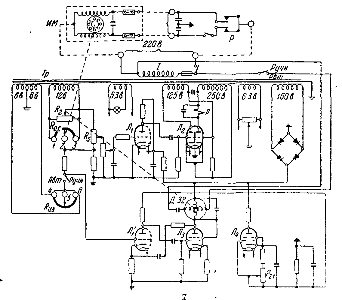 Для настройки И-части, т. е. для того чтобы получать разные средние скоВнрости двигателя при одинаковых сигналах на входе, каскад усиления напряжеВнния И-части питают импульсным напряжением от генератора импульсов, соВнбранного на тиратроне (лампа Л4). Постоянную времени генератора можно изменять, перемещая движок сопротивления Р21, служащего для настройки времени удвоения.