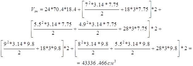 SFi*Hi = {[252*3.14/4 + 162*3.14/4 + 20.5*33 тАУ 11.52*3.14/2 тАУ 102*3.14/2 тАУ 7.52*3.14/2]*25.3 + [(7.52 тАУ 6.52)*3.14]*20.3/2 + [3.14*2.25*32.18 + 3.14*2.25*29.04]*9.8 + 22*.08*27 + [18.2*1.9 + 6.2*1.9]*20.3 + [5*5.5 + 5*5.5 + 3*5.5]*20.3 +[11.5*5.5 + 10*5.5 + 2*3.14*1.52]*34.8}*2 = 46306.084.