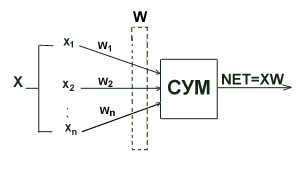 представлена модель, реализующая эту идею. Хотя сетевые парадигмы весьма разнообразны, в основе почти всех их лежит эта конфигурация. Здесь множество входных сигналов, обозначенных x1, x2, x3..xn, поступает на искусственный нейрон. Эти входные сигналы, в совокупности обозначаемые вектором X, соответствуют сигналам, приходящим в синапсы биологического нейрона. Каждый сигнал умножается на соответствующий вес w1, w2, w3..wn, и поступает на суммирующий блок, обозначенный СУМ. Каждый вес соответствует "силе" одной биологической синоптической связи. (Множество весов в совокупности обозначается вектором W). Суммирующий блок, соответствующий телу биологического элемента, складывает взвешенные входы алгебраически, создавая выход, который мы будем называть NET. В векторных обозначениях это может быть компактно записано следующим образом.