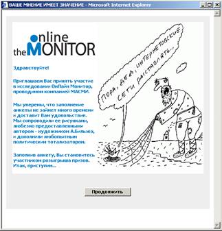 Московская Ассоциация Средств Массовой Информации, заранее проанализировав потенциальных посетителей этого сайта, приняло решение разместить анкету опроса именно на этом сайте, который посвящен вопросам дизайна. В данном случае исследования были направлены на конкретную социальную группу людей. Конечно посетителями этого сайта опрос не ограничился. Кроме этого ресурса Интернета форма опроса появлялась и на сайтах крупных торговых холдингов, предприятий, промышленных групп и всевозможных социологических бюро.
