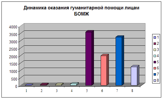 С 1996 года до апреля 2003 года около 7000 человек, проживающих в стенах ДНП ВлЛюблиноВ» получили гуманитарную помощь в виде продуктов питания, одежды и обуви: 2000 г. тАУ 2108 человек получили продукты питания, 641 человек одежду, 810 человек - обувь; в 2001 году тАУ 1038 человек получили продукты питания, 678 человек тАУ вещевую помощь, 312 человек тАУ обувь; в 2002 году тАУ 1495 человек тАУ продукты питания, 1187 человек получили одежду, 524 человек тАУ обувь; за 1 квартал 2003 года тАУ 750 человек получили продукты питания, вещевую помощь получили 216 человек, обувь 273 человека (диаграмма № 4) [№ 10]