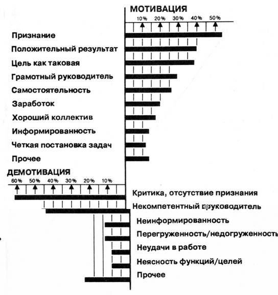 О каких же мотивах идет речь? Прикладная психология разделяет мотиваторы и демотиваторы, влияющие на производительность и удовлетворенность работой. В одной из крупных фирм (более 500 человек) в течении целого ряда лет проводился опрос, связанный с мотивацией: