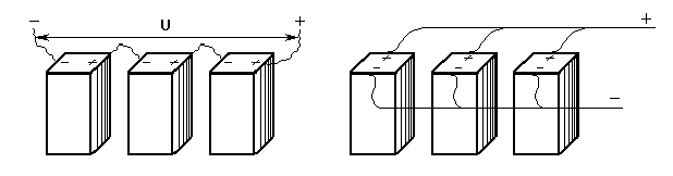 Рис.6. Последовательное и параллельное соединение элементов в батарею.