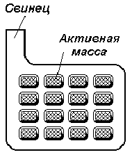 Пластины современных аккумуляторов изготовляются решетчатыми (рис.8) и заполняются активной массой, состоящей из диоксида свинца для положительных пластик и губчатого (мелко раздробленного) свинца для отрицательных.