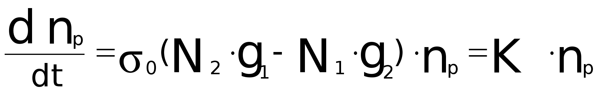, g1 тАУ статистический вес уровня. Сечение вынужденного излучения 21=0*g1, вынужденного поглощения 12=0*g2. Процессы индуцированного излучения сопровождаются усилением электромагнитных волн. Пусть через среду, в которой частицы могут находиться в состояниях 1 и 2 с энергиями возбуждения 1 и 2 проходит поток монохроматического излучения удовлетворяющего соотношению h0=2-1. Пусть плотность частиц в этих состояниях N1 и N2. Уравнение баланса плотности фотонов в пучке имеет вид: