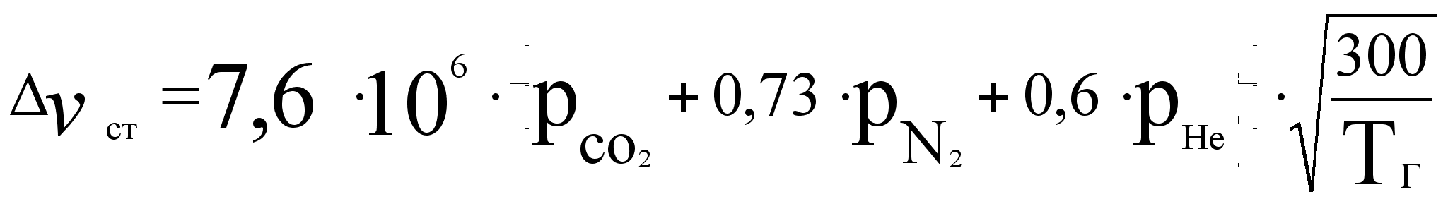 03*10-2 Гц. Однако обычно ширина линии излучения определяется не спонтанным излучением а релаксационными безизлучательными переходами, происходящими при взаимодействии возбуждённой частицы с другими частицами. Любой релаксационный процесс приводит к сокращению времени жизни частицы в возбуждённом состоянии, а следовательно, к уширению соответствующей этому состоянию линии излучения. Релаксационное уширение происходит за счёт безизлучательных процессом при столкновении частиц и этот процесс называют столкновительное уширение. По аналогии с естественный шириной линии, принимая cт - время жизни частицы в возбуждённом состоянии столкновительное уширенение определяется как