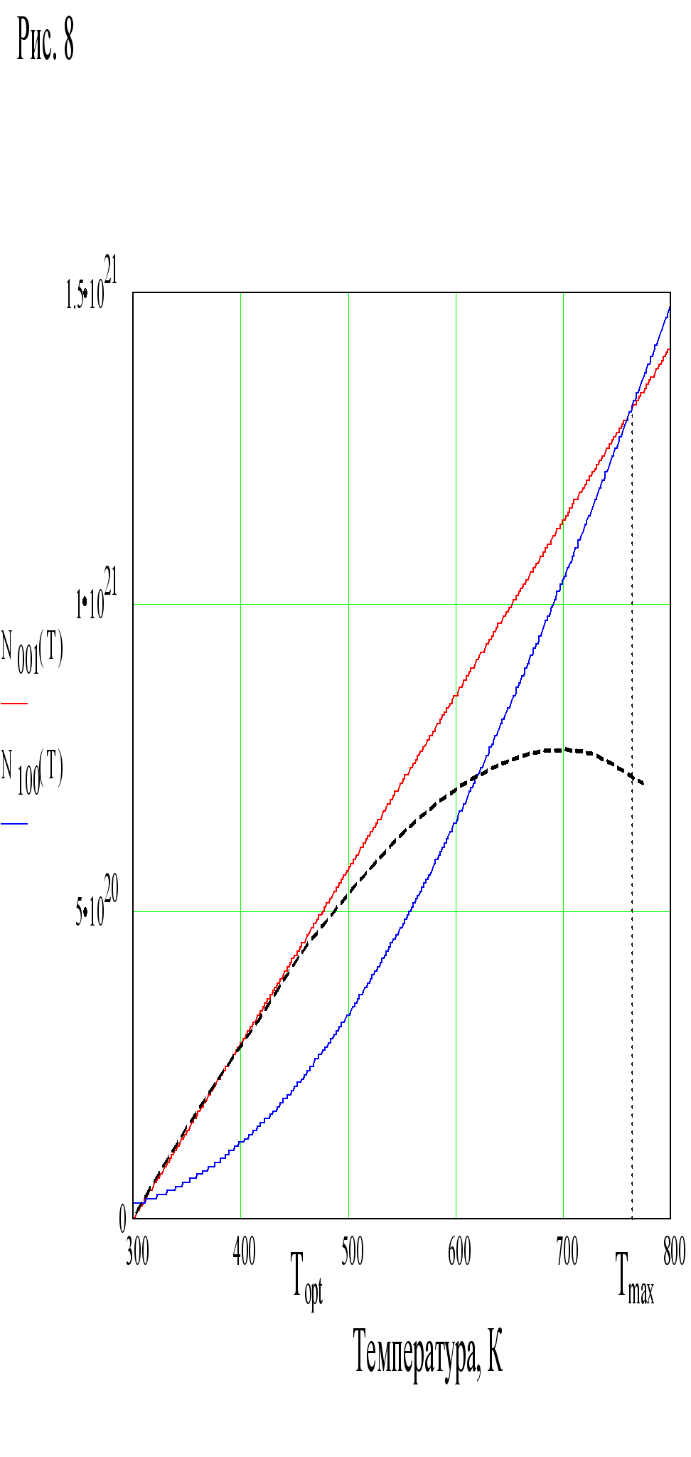 нверсия достигается при оптимальных температурах смеси Торt. Для смеси с г1,5*10-1 Вт/(м*К), Тстенки300К зависимость населённости лазерных уровней от температуры показана на рис. 8. Типичные значения Тopt400..500К, Тмах700..800К.