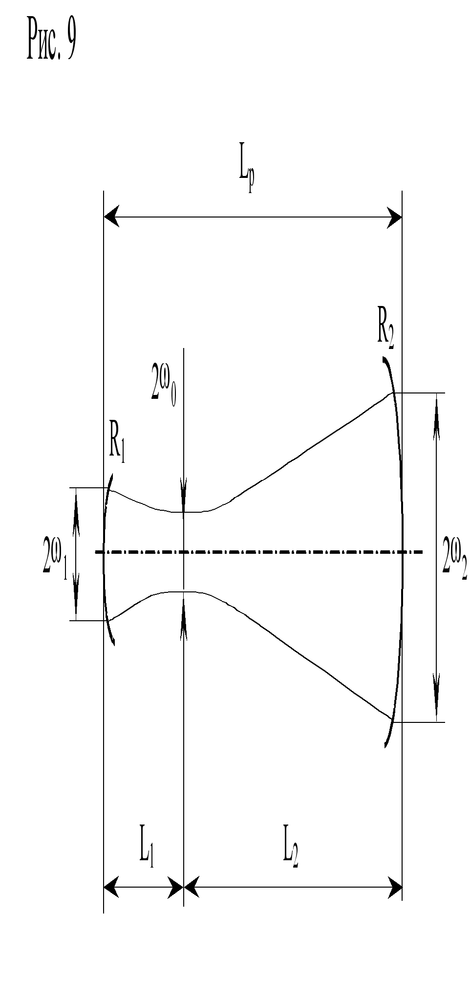 . Расстояние между зеркалами Lp в этом выражении всегда положительно, а R1 и R2 положительны только для вогнутых т.е. фокусирующих зеркал и отрицательны для зеркал с выпуклой поверхностью. Для устойчивых резонаторов существует стационарное распределение интенсивности электромагнитного поля. В общем случае интенсивность излучения в устойчивых резонаторах распределена не равномерно по всему объёму резонатора, а сосредоточена внутри области, называемой каустикой (рис.9). Радиусы 1, 2, этой области на зеркалах а также её минимальный радиус 0 в месте перетяжки определяются длиной волны и параметрами резонатора (R1, R2, Lp). Для основного типа колебаний их можно рассчитать с помощью соотношений: