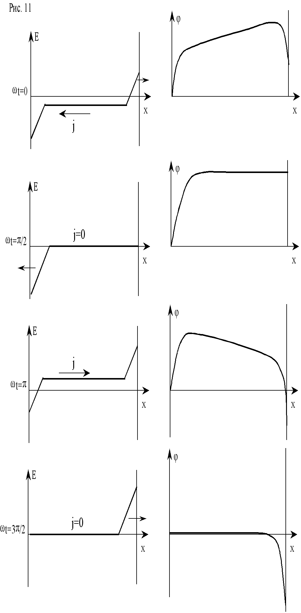 еподвижны и однородно распределены по длине промежутка, а диффузионное движение электронов отсутствует. На самом деле диффузия размывает границы между плазмой и ионными слоями. На рис. 11 построены соответствующие рис.10 распределения поля и потенциала в те же моменты времени через каждые четверть периода. Поле Е в однородной электронейтральной части промежутка постоянно по его длине. Потенциал для определённости отсчитывается от левого электрода. Можно себе представить, что он заземлён, а переменное напряжение подаётся на правый. Значение и направление электрического тока, можно считать, характеризуется напряженностью поля Е в плазме, так как чаще всего в самой плазме ток проводимости преобладает над током смещения.