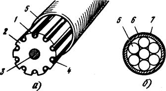 1тАФ профилированный сердечник; 2 тАФ силовой элемент; 3 тАФ волокно; 4 тАФ внутренняя пластмассовая оболочка; 5тАФстальная проволока; 6тАФнаружная полиэтиленовая оболочка; 7тАФ