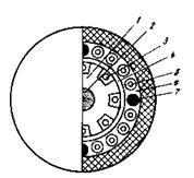 Представляют интерес ОК французского производства (рис.6). Они, как правило, комплектуются из унифицированных модулей, состоящих из пластмассового стержня диаметром 4 мм с ребрами по периметру и десяти ОВ, расположенных по периферии этого стержня. Кабели содержат 1, 4, 7 таких модулей. Снаружи кабели имеют алюминиевую и затем полиэтиленовую оболочку.