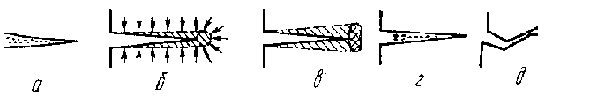 Рис. 7. Схемы механизмов закрытия трещины, обусловленных вязкостью рабочей среда (а), фазовыми превращениями в зоне предразрушения (б), ЗТП (в), ЗТО (г) и ЗТШ (д).