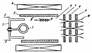1 - термокатод, 2 - экран катода,3 - цилиндрический анод, 4 - соленоид, 5 - ввод рабочего газа,6 - плазма,7 - эмиссионный электрод, 8 - ускоряющий электрод, 9 - замедляющий электрод, 10 - ионный пучен