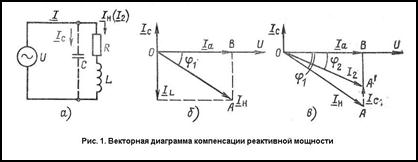 Наглядное представление о сущности компенсации реактивной мощности даёт (рис.1) На (рис 1 а) изображена схема электрической цепи. Пусть до компенсации потребитель имел активную мощность Р, соответственно ток