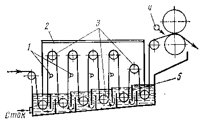 Он представляет собой закрытую ванну 2 с двумя гидрозатворами на входе и выходе ткани, движущейся по направляющим роликам 3. Внутри ванны установлены дырчатые паровые трубки 1 для подачи острого пара. В выщелачивателе осуществляется интенсивный противоток с помощью наклонного дна с перегородками 5, образующие секции с карманами. Перегородки устанавливаются парами так, что одна из них доходит до дна, а соседняя с ней не доходит, образуя щель, через которую может переливаться раствор. Вода из спрыска 4 стекает в последнюю секцию и через карман переливается в соседнюю секцию, вытесняя более плотный раствор смывного щелока снизу вверх последовательно через все секции навстречу движению ткани, противотоком до самого стока в предыдущую ванну. Совместное воздействие пара и активного противотока способствует эффективному обесщелачиванию ткани.