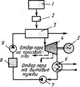 Теплоэлектроцентраль отлиВнчается от конденсационной станции установленной на ней специальной теплофикационной турбиной с отбором пара. На ТЭЦ одна часть пара полностью используется в турбине для выработки электроэнергии в генераторе 5 и затем поступает в конденсатор 6, а другая, имеющая большую температуру и давление (на рис. штриховая лиВнния), отбирается от промежуточной ступени турбины и испольВнзуется для теплоснабжения. Конденсат насосом 7 через деаэраВнтор 8 и далее питательным насосом 9 подается в парогенератор. Количество отбираемого пара зависит от потребности предприяВнтий в тепловой энергии.