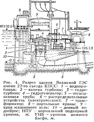 В состав сооружений русловой ГЭС, кроме плотины, входят здание ГЭС и воВндосбросные сооружения (рис. 4). Состав гидротехнических сооружений зависит от выВнсоты напора и установленной мощности. У русловой ГЭС здание с размещенными в нём гидроагрегатами служит продолжеВннием плотины и вместе с ней создаёт напорный фронт. При этом с одной стоВнроны к зданию ГЭС примыкает верхний бьеф, а с другой тАФ нижний бьеф. ПодВнводящие спиральные камеры гидротурбин своими входными сечениями закладыВнваются под уровнем верхнего бьефа, выходные же сечения отсасывающих труб погружены под уровнем нижнего бьефа.