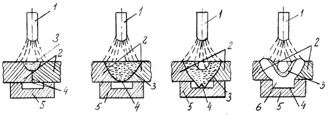 1 тАУ электрод; 2 тАУ свариваемый металл; 3 тАУ расплавленный металл сварочной ванны; 4 тАУ окисные пленки на поверхности соединяемых кромок; 5 тАУ подкладка с канавкой; 6 тАУ металл шва.