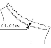1 2 3 4 | Викроювання обшивки Обробка горловини Пришивання обшивки до горловини Заключна ВТО | Викроiти деталь обшивки по формi горловини плаття з двох або бiльше деталей 1. Зшити деталi обшивки 2. Обметати зрiзи обшивки 3. Перевiрити вiдповiднiсть внутрiшнього зрiзу обшивки довжинi горловини 1. Скласти обшивки лицевою частиною до лицевоi частини виробу, сумiстити шви зшивання обшивки з вiдповiдними точками на горловинi 2. Пришити обшивку шириною шва 0,5 тАУ 0,7 см з боку горловини виробу. 3. Пiдрiзати припуски на шви, зробити надсiчки 4. вiдiгнути обшивку на виворiтну сторону 5. Припрасувати, повертаючи припуски на шви в бiк обшивки, випускаючи кант з виворотнього боку на 0,1-0,2 см 6. Закрiпити припуск на шов до обшивки оздоблюючою строчкою. 7. Закрiпити вiдлiтний край обшивки ручними стiбками до припускiв на шов основноi деталi. Припрасувати обшивку до горловини. |