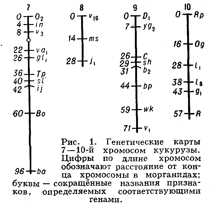 Генетические карты хромосом составляют для каждой пары гомологичных хромосом. Группы сцепВнления нумеруют последовательно, по мере их обнаружения. Кроме номера группы сцепления, указывают полные или сокраВнщённые назв. мутантных генов, их расВнстояния в морганидах от одного из концов хромосомы, принятого за нулевую точВнку, а также место центромеры. СостаВнвить Генетические карты хромосом можно только для объекВнтов, у которых изучено большое число мутантных генов. Например, у дрозофилы идентифицировано свыше 500 генов, локалиВнзованных в её 4 группах сцепления, у кукурузы тАФ около 400 генов, распредеВнлённых в 10 группах сцепления (рис. 1). У менее изученных объектов число обВннаруженных групп сцепления