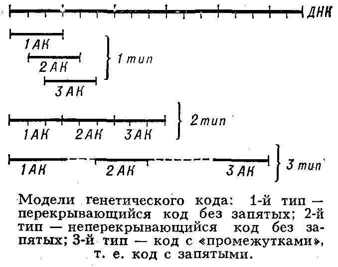 аденин (А), гуанин (Г), цитозин (Ц), тимин (Т); в РНК вместо тимина присутВнствует урацил (У). Кроме них, в составе нуклеиновых к-т обнаружено ок. 20 редВнко встречающихся (т. н. неканонических, или минорных) оснований, а также неВнобычных Сахаров. Так как количество кодируюВнщих знаков Генетического кода (4) и число разновидВнностей аминокислот в белке (20) не совВнпадают, кодовое число (т. е. кол-во нуклеотидов, кодирующих 1 аминокисВнлоту) не может быть равно 1. Различных сочетаний по 2 нуклеотида возможно лишь 42 = 16, но этого также недостаточВнно для зашифровки всех аминокислот. Американский учёный Г. Гамов предложил (1954) модель т р и п л е т н о г о генетического кода, т. е. такого, в котором 1 аминокислоту кодиВнрует группа из трёх нуклеотидов, называемых кодоном. Число возможных триплетов равно 43 = 64, а это более чем втрое преВнвышает число распространённых аминоВнкислот, в связи с чем было высказано предположение, что каждой аминокислоте соответствует несколько кодонов (так называемая выВнрожденность кода). Было предложено много различных моделей генетического кода, из которых серьёзного внимания заслуживали три модели (см. рис.): перекрывающийся код без запятых, неперекрывающийся код без запятых и код с запятыми. В 1961 Ф. Крик (Великобритания) с сотрудниВнками получил подтверждение гипотезы триплетного неперекрывающегося кода без запятых. Установлены след. осн. заВнкономерности, касающиеся генетического кода: 1) между последовательностью нуклеотидов и кодируемой последовательностью амиВннокислот существует линейное соответВнствие (коллинеарность генетического кода); 2) считываВнние кода начинается с определённой точки; 3) считывание идёт в одном наВнправлении в пределах одного гена; 4) код является неперекрывающимся; 5) при считывании не бывает промежутков (код без запятых); 6) генетический код, как правило, явВнляется вырожденным, т. е. 1 аминокисВнлоту кодируют 2 и более триплетов-сиВннонимов (вырожденность генетического кода уменьВншает вероятность того, что мутационная замена основания в триплете приведёт к ошибке); 7) кодовое число равно трём;