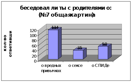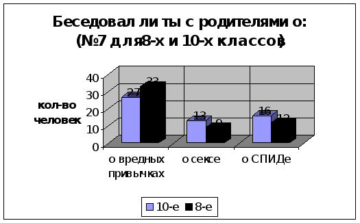 Рассмотрим результаты вопроса №7(диаграмма4). Заметны довольно странные показатели: о вредных привычках в 8-ом классе бесед с родителями было больше, чем в 10-ом. Это можно объяснить постепенной ВладаптациейВ» наших родителей к современной жизни: мол человек в десятом классе- всё уже знает, человек в восьмом классе- надо с ним поговорить, но не о сексе и о СПИДе, а о вредных привычках. Странная склонность родителей разговаривать о СПИДе, не затрагивая при этом тему секса, видна в обоих случаях, что доказывает их некомпетентность в данной области.